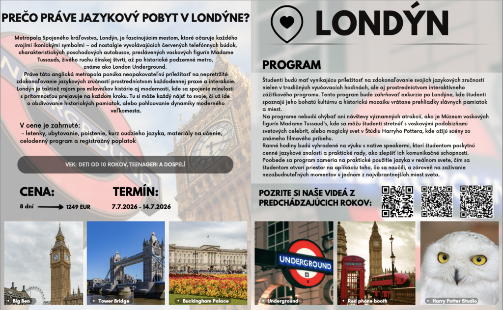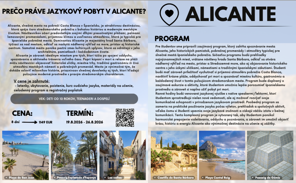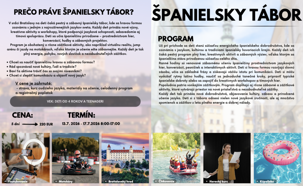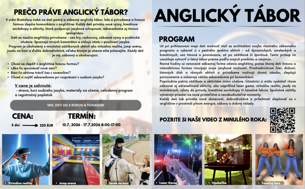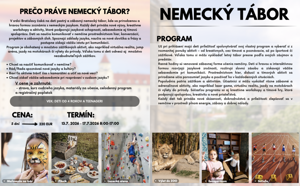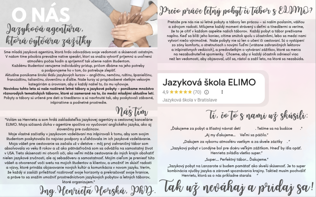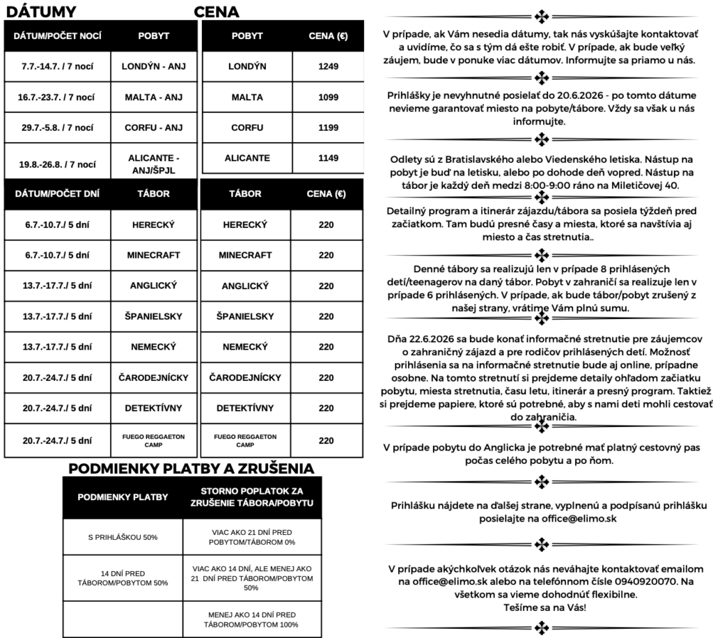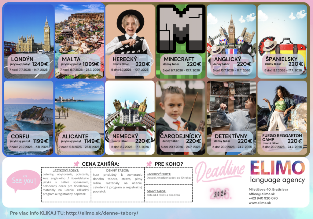 Jazykové pobyty a tábory 2026 Celú ponuku jazykových pobytov a táborov nájdete nižšie.Pre viac infomácií volajte na +421 940 920 070 alebo píšte na office@elimo.skVyplnené prihlášky posielajte emailom na office@elimo.sk Please enable JavaScript in your browser to complete this form.Meno rodiča: *Meno účastníka: *Adresa: *Email: *Telefónne číslo: *Letný pobyt alebo tábor + termín: *LONDÝN POBYT: 7.7.2026-14.7.2026/ 7 NOCÍ/ 1249 EURMALTA POBYT: 16.7.2026-23.7.2026/ 7 NOCÍ/ 1099 EURKORFU POBYT: 29.7.2026-5.8.2026/ 7 NOCÍ/ 1199 EURALICANTE POBYT: 19.8.2026-26.8.2026/ 7 NOCÍ/ 1149 EURHERECKÝ TÁBOR: 6.7.2026-10.7.2026/ 5 DNÍ/ 220 EURMINECRAFT TÁBOR: 6.7.2026-10.7.2026/ 5 DNÍ/ 220 EURANGLICKÝ TÁBOR: 13.7.2026-17.7.2026/ 5 DNÍ/ 220 EURŠPANIELSKY TÁBOR: 13.7.2026-17.7.2026/ 5 DNÍ/ 220 EURNEMECKÝ TÁBOR: 13.7.2026-17.7.2026/ 5 DNÍ/ 220 EURČARODEJNÍCKY TÁBOR: 20.7.2026-24.7.2026/ 5 DNÍ/ 220 EURDETEKTÍVNY TÁBOR: 20.7.2026-24.7.2026/ 5 DNÍ/ 220 EURFUEGO REGGAETON TÁBOR: 20.7.2026-24.7.2026/ 5 DNÍ/ 220 EURTermíny sa nedajú meniť - posledné dostupné termíny sú tieto. Počet dní, ktorých sa plánujem zúčastniť:Ak menej ako 5, uveďte aj dni v týždni. Vek účastníka: *Aktivity v programe, ktoré preferujem (označte všetky, ktoré preferujete) (IBA DENÉ TÁBORY V BRATISLAVE): Výlet do zoo BratislavaVýlet do Slobody zvierat a venčenie psíkovVýlet na kone a jazda na poníkochVýlet na hrady- Bratislavský a DevínVýlet na SandbergVýlet do GerulatyAquapark/KúpaliskoOpekačka v prírodeTúra v prírodeJogaTanečný kurzŠportové hrySúťažeVýroba a modelácia oblečenia, šperkov a dámskych vecičiekVýroba rôznych vecičiekMalovanie na tvárPrednáška o prvej pomociLezecká stenaJump arénaTarzaniaYoutubovanieVareniePiknikRybníkyMúzeum ( dopravy, železničné alebo zbraní)SlavínVirtuálna realitaTriplandMotokáryEscape Room Alica v krajine zázrakovBotanická záhradaČlnkovanie Železná študničkaLevandulandČervený kameňInéAktivity, ktoré preferujem a nie sú v zozname (moje návrhy) (POBYTY AJ TÁBORY):Poznámky, pripomienky, alergie, zdravotné záznamy: Ak máte akékoľvek požiadavky či otázky neváhajte ich sem napísať!Súhlas so spracovaním osobných údajov: *SúhlasímAko uvádzané dotknuté osoby podľa § 7 zák.č. 428/2002 Z.z. o ochrane osobných údajov v znení neskorších predpisov súhlasíte s možnosťou spracovania uvádzaných osobných údajov na účely dokumentácie a účtovnej agendy. Osobné údaje budú po spracovaní archivované po dobu zákonom stanovených lehôt a následne dané na likvidáciu. Ako zákonný zástupca študenta súhlasíte so spracúvaním fotografií a iných obrazových záznamov Vášho dieťaťa, získaných počas činnosti pobytu, na účely propagácie spoločnosti a zverejnenia na webovej stránke. Uvedený súhlas je platný až do písomného odvolania. Viac podrobnosti o spracovávaní osobných údajov nájdete nižšie. Záväzne sa prihlasujem na letný tábor 2025: *SúhlasímOdoslaním tejto záväznej prihlášky sa záväzne prihlasujete na letný tábor/pobyt uvedený v tejto prihláške a súhlasíte so všetkými podmienkami jazykového tábora/pobytu, ako aj s cenou a podmienkami zrušenia a poplatkoch. Touto prihláškou sa zaväzujete zaplatiť za pobyt nasledovne: 50% s prihláškou, 50% 14 dní pred nástupom IBAN: SK32 1100 0000 0029 4816 7779 Do poznámky uviesť: TÁBOR _ PRIEZVISKO2026 (príklad: anglicky_ horska2026) MessagePrihlásiť Viac informácii o spracovávaní osobných údajov TU