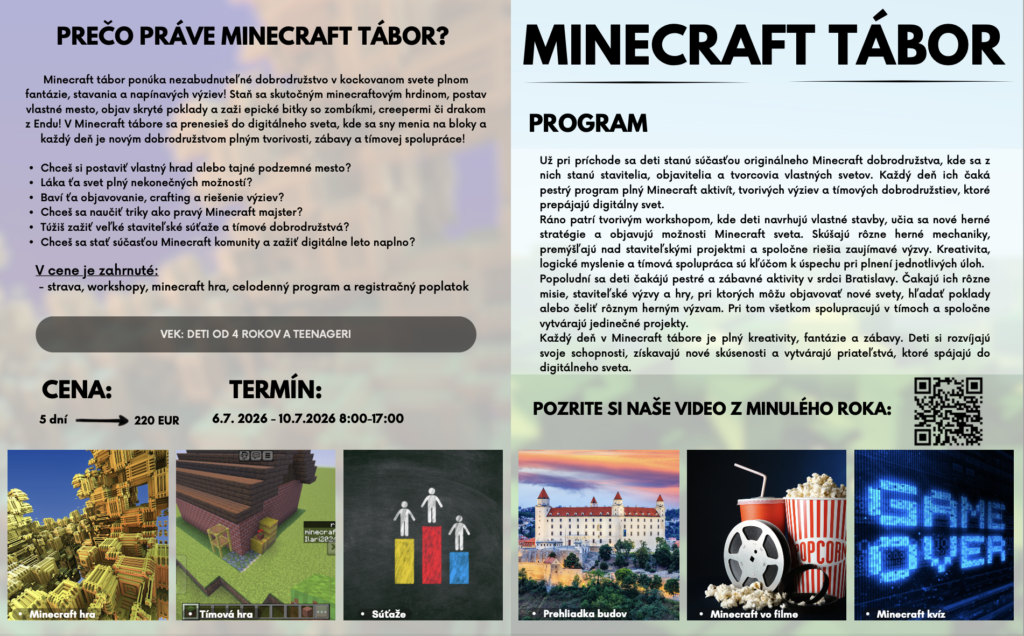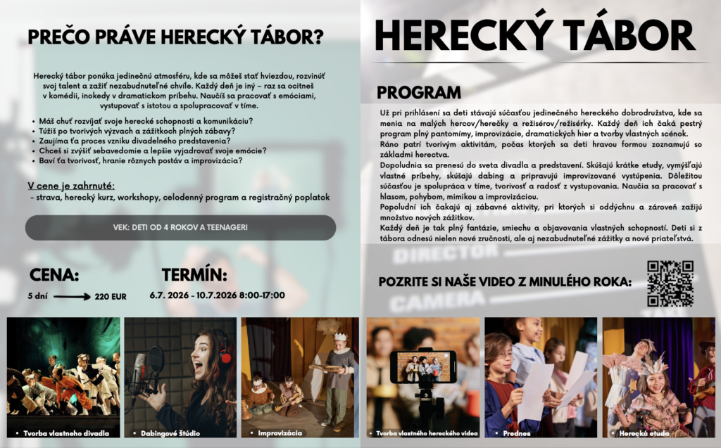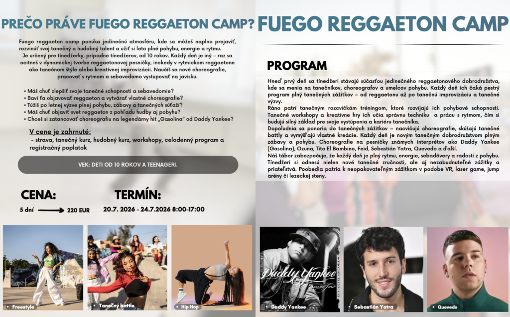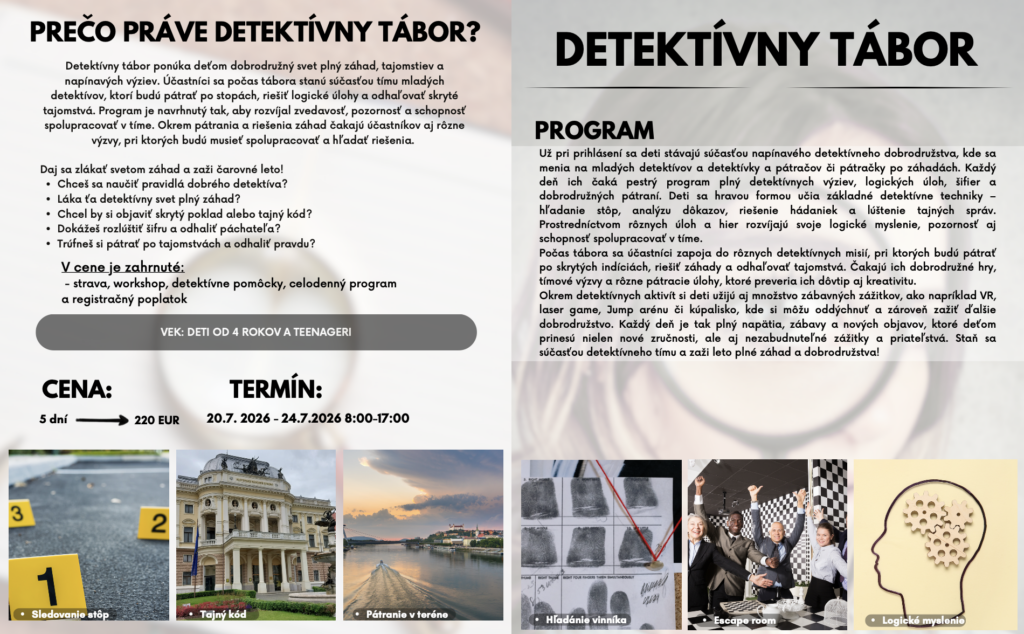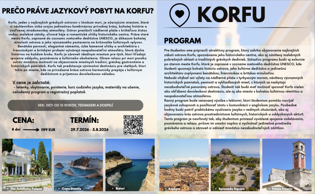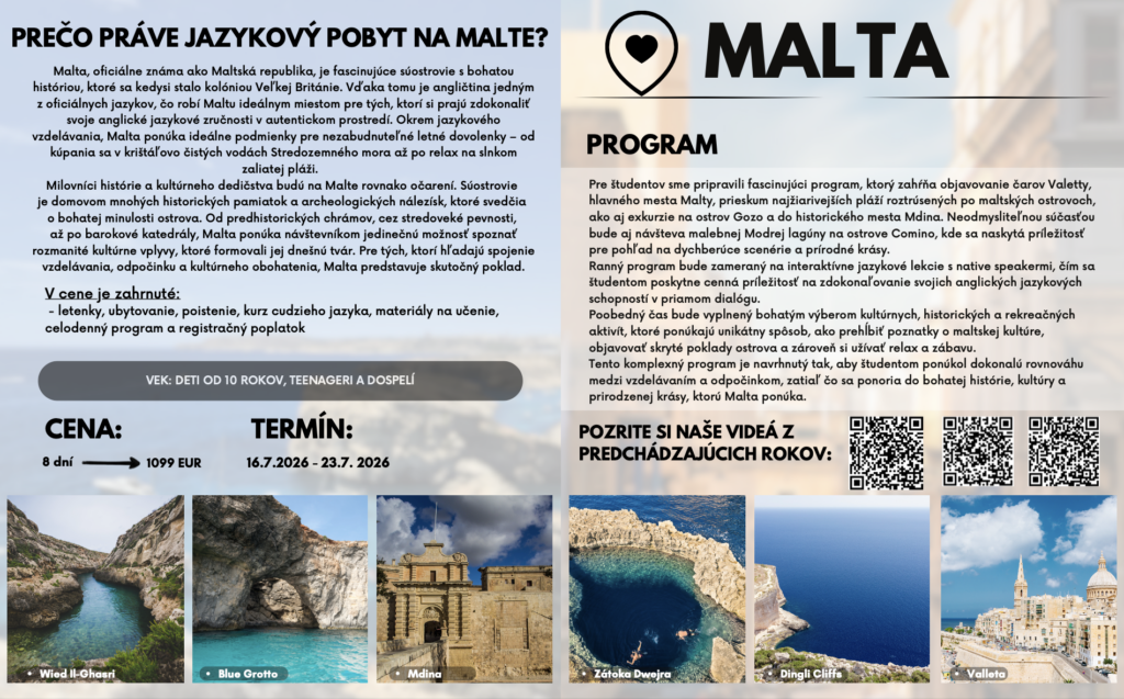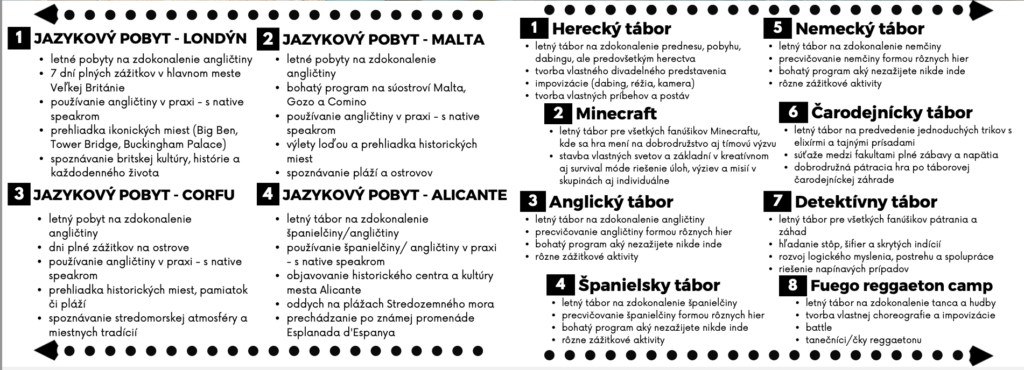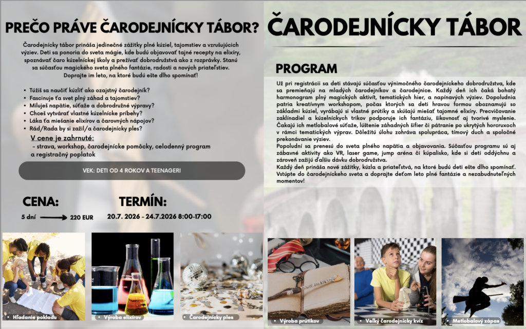 Jazykové pobyty a tábory 2026 Celú ponuku jazykových pobytov a táborov nájdete nižšie.Pre viac infomácií volajte na +421 940 920 070 alebo píšte na office@elimo.skVyplnené prihlášky posielajte emailom na office@elimo.sk Please enable JavaScript in your browser to complete this form.Meno rodiča: *Meno účastníka: *Adresa: *Email: *Telefónne číslo: *Letný pobyt alebo tábor + termín: *LONDÝN POBYT: 7.7.2026-14.7.2026/ 7 NOCÍ/ 1249 EURMALTA POBYT: 16.7.2026-23.7.2026/ 7 NOCÍ/ 1099 EURKORFU POBYT: 29.7.2026-5.8.2026/ 7 NOCÍ/ 1199 EURALICANTE POBYT: 19.8.2026-26.8.2026/ 7 NOCÍ/ 1149 EURHERECKÝ TÁBOR: 6.7.2026-10.7.2026/ 5 DNÍ/ 220 EURMINECRAFT TÁBOR: 6.7.2026-10.7.2026/ 5 DNÍ/ 220 EURANGLICKÝ TÁBOR: 13.7.2026-17.7.2026/ 5 DNÍ/ 220 EURŠPANIELSKY TÁBOR: 13.7.2026-17.7.2026/ 5 DNÍ/ 220 EURNEMECKÝ TÁBOR: 13.7.2026-17.7.2026/ 5 DNÍ/ 220 EURČARODEJNÍCKY TÁBOR: 20.7.2026-24.7.2026/ 5 DNÍ/ 220 EURDETEKTÍVNY TÁBOR: 20.7.2026-24.7.2026/ 5 DNÍ/ 220 EURFUEGO REGGAETON TÁBOR: 20.7.2026-24.7.2026/ 5 DNÍ/ 220 EURTermíny sa nedajú meniť - posledné dostupné termíny sú tieto. Počet dní, ktorých sa plánujem zúčastniť:Ak menej ako 5, uveďte aj dni v týždni. Vek účastníka: *Aktivity v programe, ktoré preferujem (označte všetky, ktoré preferujete) (IBA DENÉ TÁBORY V BRATISLAVE): Výlet do zoo BratislavaVýlet do Slobody zvierat a venčenie psíkovVýlet na kone a jazda na poníkochVýlet na hrady- Bratislavský a DevínVýlet na SandbergVýlet do GerulatyAquapark/KúpaliskoOpekačka v prírodeTúra v prírodeJogaTanečný kurzŠportové hrySúťažeVýroba a modelácia oblečenia, šperkov a dámskych vecičiekVýroba rôznych vecičiekMalovanie na tvárPrednáška o prvej pomociLezecká stenaJump arénaTarzaniaYoutubovanieVareniePiknikRybníkyMúzeum ( dopravy, železničné alebo zbraní)SlavínVirtuálna realitaTriplandMotokáryEscape Room Alica v krajine zázrakovBotanická záhradaČlnkovanie Železná študničkaLevandulandČervený kameňInéAktivity, ktoré preferujem a nie sú v zozname (moje návrhy) (POBYTY AJ TÁBORY):Poznámky, pripomienky, alergie, zdravotné záznamy: Ak máte akékoľvek požiadavky či otázky neváhajte ich sem napísať!Súhlas so spracovaním osobných údajov: *SúhlasímAko uvádzané dotknuté osoby podľa § 7 zák.č. 428/2002 Z.z. o ochrane osobných údajov v znení neskorších predpisov súhlasíte s možnosťou spracovania uvádzaných osobných údajov na účely dokumentácie a účtovnej agendy. Osobné údaje budú po spracovaní archivované po dobu zákonom stanovených lehôt a následne dané na likvidáciu. Ako zákonný zástupca študenta súhlasíte so spracúvaním fotografií a iných obrazových záznamov Vášho dieťaťa, získaných počas činnosti pobytu, na účely propagácie spoločnosti a zverejnenia na webovej stránke. Uvedený súhlas je platný až do písomného odvolania. Viac podrobnosti o spracovávaní osobných údajov nájdete nižšie. Záväzne sa prihlasujem na letný tábor 2025: *SúhlasímOdoslaním tejto záväznej prihlášky sa záväzne prihlasujete na letný tábor/pobyt uvedený v tejto prihláške a súhlasíte so všetkými podmienkami jazykového tábora/pobytu, ako aj s cenou a podmienkami zrušenia a poplatkoch. Touto prihláškou sa zaväzujete zaplatiť za pobyt nasledovne: 50% s prihláškou, 50% 14 dní pred nástupom IBAN: SK32 1100 0000 0029 4816 7779 Do poznámky uviesť: TÁBOR _ PRIEZVISKO2026 (príklad: anglicky_ horska2026) MessagePrihlásiť Viac informácii o spracovávaní osobných údajov TU